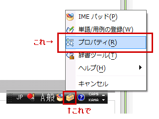④IMEツールバー(言語バー)から「ツール」→「プロパティ」と開きます