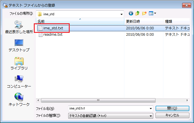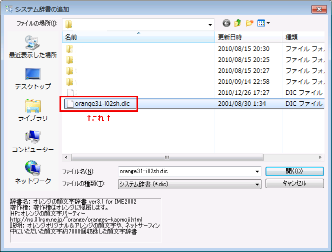 ⑥先ほどコピーした辞書ファイルを選択し追加します