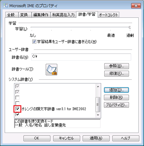 ⑤プロパティ画面の辞書/学習タブからシステム辞書の追加をします