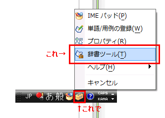 ②IMEツールバー(言語バー)から「ツール」→「辞書ツール」と開きます