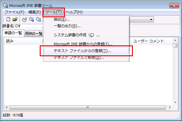③辞書ツール画面で「ツール」→「テキストファイルからの登録」と開きます