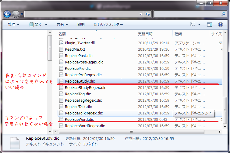 この二つは読み上げの際の置換情報が記載されたファイルですが、Replacestudy.dicは「教育」コマンドによって登録された単語が入っています。